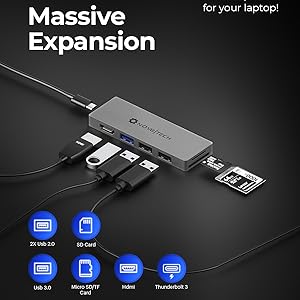 Apple have annoyed a huge number of people with their policy of only providing just to two USB C ports on their new range of MacBooks. This clever little device/interface addresses that problem and gives you the variety of ports that used to be available and a few more in addition. Connection is simple but don't leave it in all the time as I suspect that in certain circumstances, the sockets will be damaged if the interface is knocked or twisted. It's still very annoying that, having spent a small fortune on buying a MacBook Air you have to then spend and extra £40 or more to make up for the shortcomings of a flawed design decision on Apple's part.