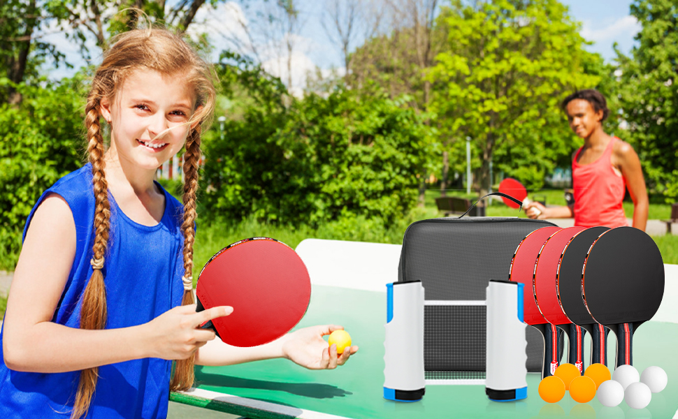 This ping pong (table tennis) set arrived packed in a clear zipped bag and my sister and I couldn't wait to try it out! (Actually bought for her to use with her SEN students and youth club).Extremely easy to set up, the net is on two retractable mounts which just clip on to a table by pressing down the blue button on the side. To remove, just press the buttons again - no tightening of metal braces etc.The 4 bats provided feel of good quality; made of wood, not plastic, with red rubber on one side, black on the other and there are 8 "bouncy" balls provided - 4 orange and 4 white.Safe and easy to set up indoors, the balls are lightweight and not likely to break any windows, though we did have to go around her living room picking them all up again 🤣Great fun, her students are going to love it from primary to secondary ages, or just the adults in the staff room! Lol