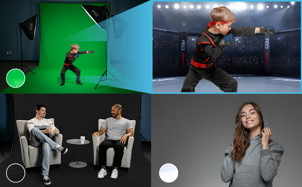 Fovitec 10'x20' Complete Studio Lighting Kit with 3 20"x28" Softbox Fluorescent Lights, Background Stand, White, Black, and Chroma Key Green Backdrops, and Carrying Case for Video and Photography