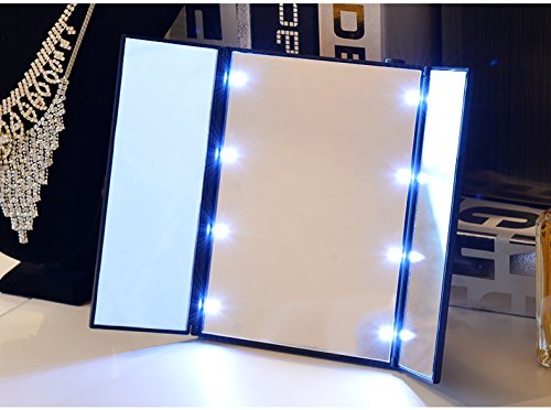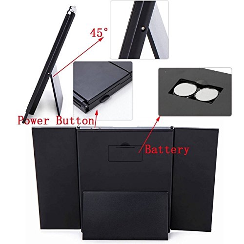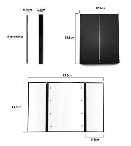 Tri-Fold Lighted Led Mirror Travel Mirror Compact Pocket Mirror Makeup with LED Specification: Color: Black Folding Size: 15 * 12 * 1.3 cm / 5.91 * 4.72 * 0.51 ' Length of Extending: 23cm / 9.05 '' Height of Stick: 11cm / 4.33 '' Width of Stick: 6.5cm / 2.55 '' Material: ABS + Mirror Glass Power: 2 x CR2032 battery (included) Package include: 1 x Mirror 2 x CR2032 battery