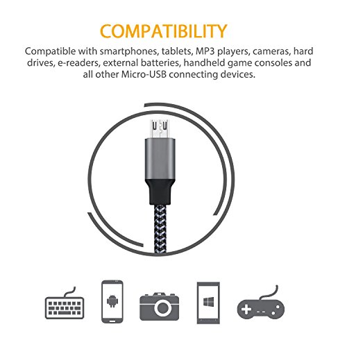 Product description Long micro usb cable 3 pack for different occasions. Wind up and bind them into the length you want for easy transport and storage. Faster Charging & Syncing This micro USB cable (Samsung Charger Lead) features reliable and high efficient, built with pure coppers, can provide a much faster charging and data exchange. Quality chipset keeps your phones safely at the same time when use the micro usb cable. Quality Nylon Materials The tangle-free nylon braided cord with aluminum connector which is more durable, more flexible and sturdier than other normal cables. The braided finish not only looks great but also prevents tangles, increases strength. Ultra Durability Sheathing the internal coppers and wires with thicker quality PVC material is to increase the durability, which can resist fraying and breaking off from pulling. Sturdy aluminum alloy connector reduces crack issue but expands service life. Universal Compatibility Samsung / Nexus / HTC / Motorola / Nokia / LG / Sony / Blackberry / PS4 / Xbox / PS Vita / GPS devices / Bluetooth speakers / wireless keyboards / digital cameras / camcorders / games consoles / e-readers/computers or other USB-enabled devices. Warranty Policy 1-year 100% worry-free satisfaction guarantee. You could enjoy risk free use or perfect replacements.