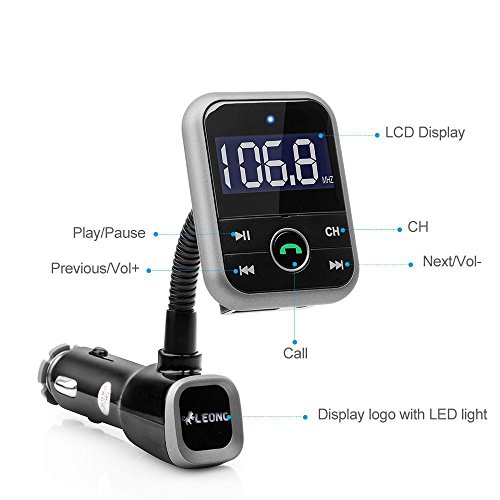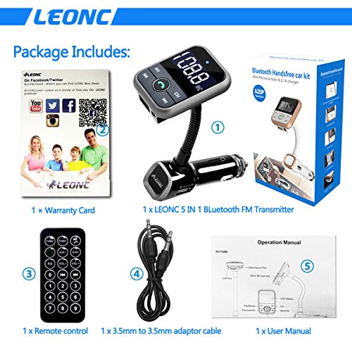 Optimal Use • LEONC 5-in-1 Wireless FM transmitter provides you ultra convenience and safety because you do not need to look for your iPhone or slide to unlock while you are in driving. • Automatically detecting function USB charging ports give you fastest charging speed during a trip or on the go for most USB devices. • Comprehensive and practical press buttons involve all the functions equipped. Remote controller for convenient using. • LCD display shows the FM number in a fastest way to find your favorite program. • Support MP3, MP4, WMA format music How To Use • When connecting via an Aux cable, you need to plug your external device first, then plug the FM transmitter, reverse operation order do not support music playing • When simultaneously connecting Bluetooth, inserting Disk U or Aux cable, the FM transmitter will default on playing music. • 5 EQ options: Natural, Rock, Pop, Classic, Jazz Features •Adjustable angle fits all types of Vehicles(12-24V) •Digital Display •Support 3.5mm Line audio Output •Support USB flash Disk Player •Support MP3, WMA format music •Remote phone call answer, hang up, reject and other functions •Support USB Charging, the maximum output voltage 5V / 2.1A •Transmitting Distance: Packing List: •1 x LEONC Bluetooth FM transmitter • 1 x Remote Controller(include battery) •1 x 3.5mm to 3.5mm Adaptor Cable• 1 x LEONC User Manual Best Guarantee: •LEONC Provides 1years Guarantee: 100% refund if the item is damaged during transportation or service on time