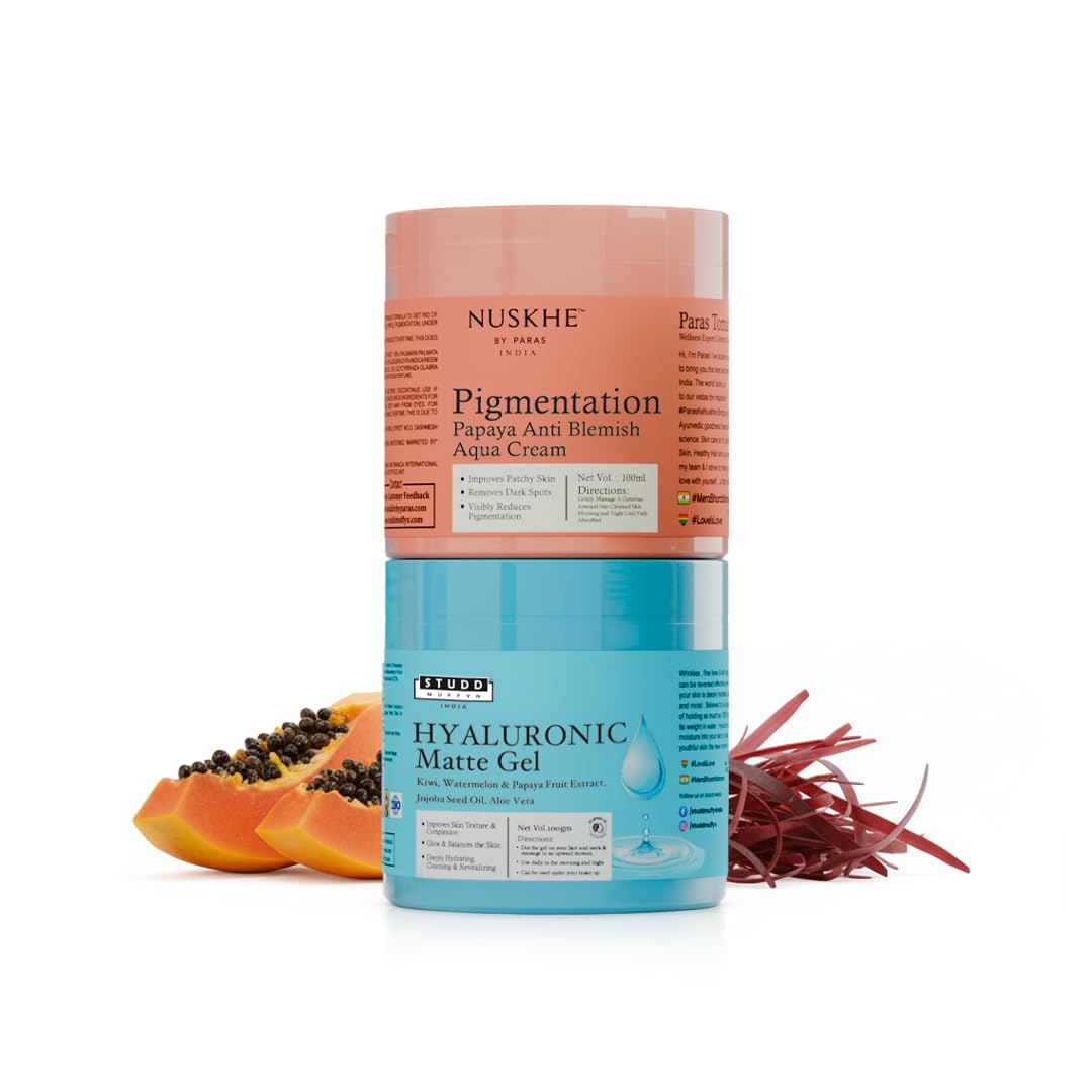Nuskhe By Paras AM PM Pigmentation Combo is a 200ml skincare duo featuring a hyaluronic acid face gel and pigmentation cream designed for deep hydration and effective pigmentation reduction. Suitable for men and women, this natural formula maintains skin’s pH balance while improving texture and complexion, delivering visible results with consistent day and night use.