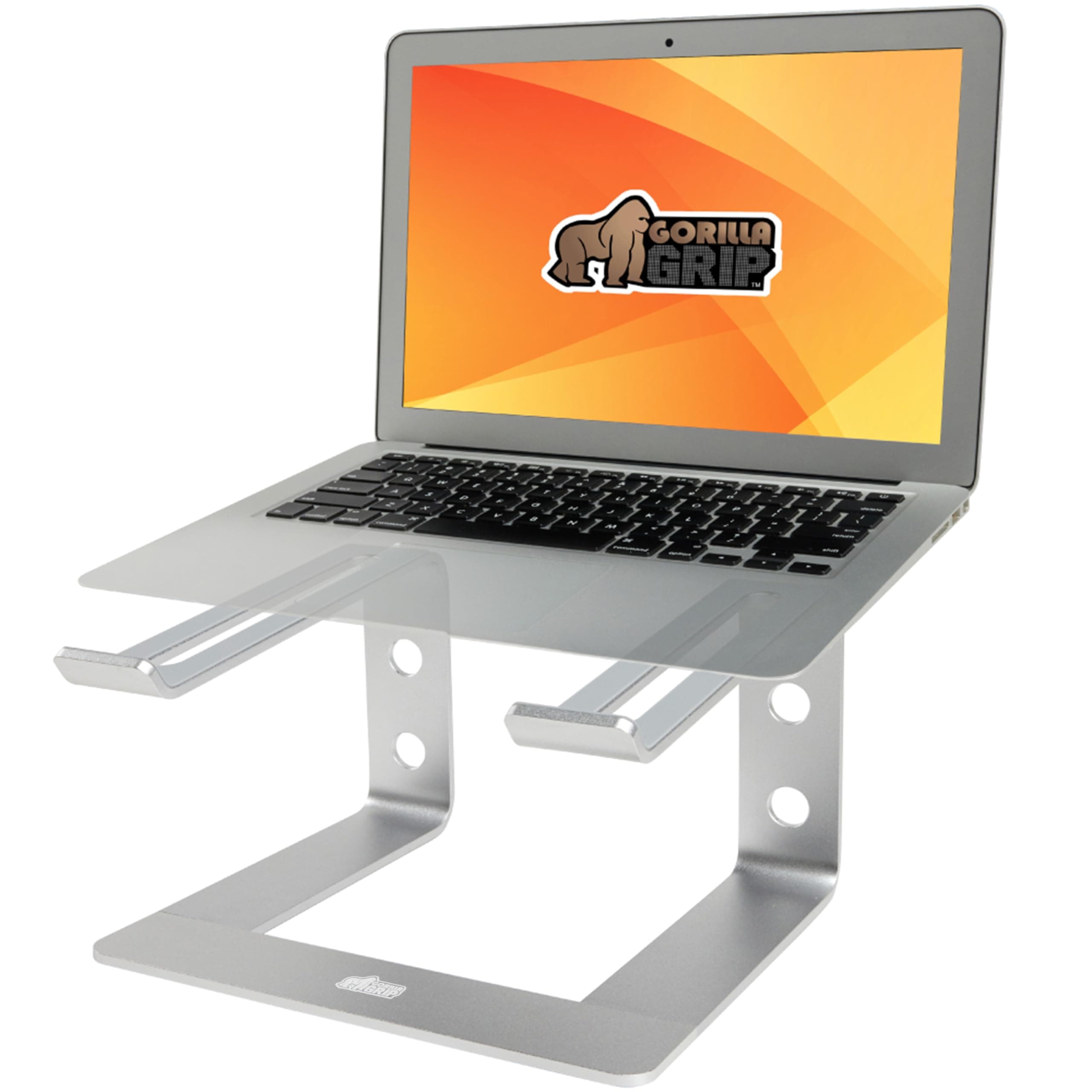 The Gorilla Grip Laptop Stand is a sturdy aluminum riser designed to elevate laptops from 10 to 15.6 inches, providing ergonomic comfort and reducing clutter. With slip-resistant grips and a ventilated design, it ensures stability and airflow, making it the perfect accessory for any modern workspace.