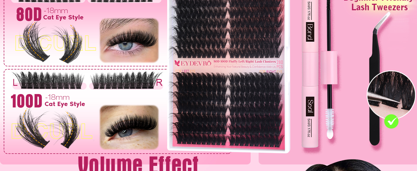 The EYDEVRO Fluffy Lash Clusters Kit offers 280 pieces of D Curl thick mega lash clusters, designed for easy application and a stunning volume effect. This kit includes waterproof lash bond and seal, along with tweezers, making it perfect for both daily use and travel. Enjoy a comfortable, reusable lash experience that rivals salon quality.