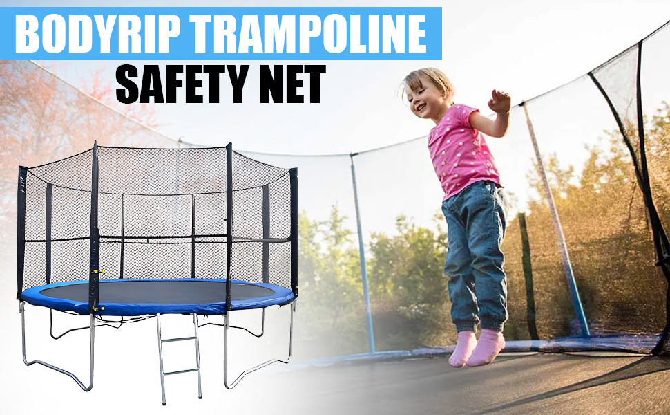The BodyRip Trampoline Safety Net Replacement features durable 4x5mm polystyrene mesh designed to prevent injuries, a double lock Velcro entry with clips for enhanced security, and UV-resistant polyethylene material that withstands harsh weather. Sized for 10ft trampolines with 8 poles, it offers easy installation and a sleek design that elevates backyard safety and style.