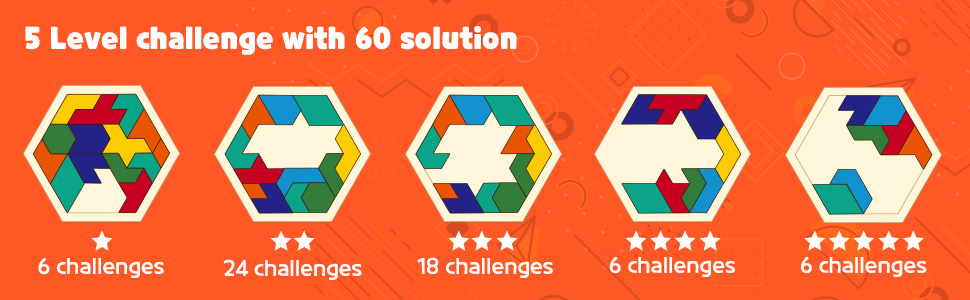 What I love about this particular Tangram Puzzle is that it is great for hours of challenges for children and adults. The children that the puzzle was bought for immediately were attractd to it with its bright colors and shapes. There was no sudden boredom from the children as they tried the different challenges (64 in the accompanying challenge book), and did their best to copy what they saw with the right shapes and colors. Adults can up the ante for fun for all with getting just about a minute to look at a particular challenge and replicating it from memory.The only thing that I found to be a negative for me is the size of the wooden hexagon base and the pieces. I imagined it to be bigger albeit the dimensons are given on the product sales page. Overall, great product!