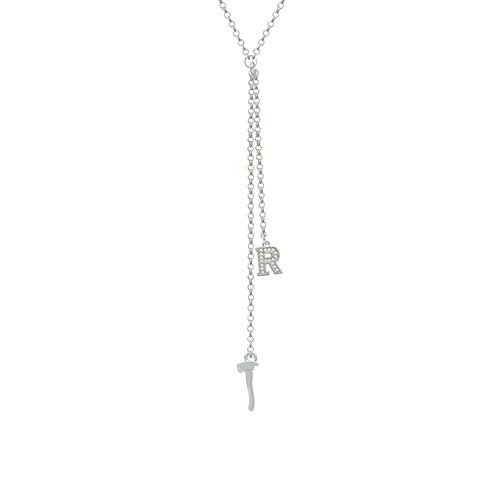 Silver Tone 3-D Axe - Initial R - Crystal Initial Y-Shaped Necklace. Silver Tone, hand enameled charms. Charm size is approx. 0.72 x 0.26 x 0.07 inches (HxWxD) including loop. 2mm Belcher Chain Necklace: 18 Inches Long. Initial Dangle is approximately 2.5 inches long. Long drop chain is 3.5 inches not including pendant. PLEASE NOTE: Our products are lead safe, but are not intended for children 14 years and younger.