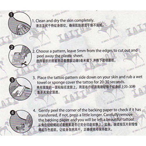 Color: Black Sizes : 10X17 cm Our temporary tattoo is safe and non-toxic.They are 100% water-proof and can stay for a week. Easy on and easy off. They can be removed with baby oil or rubbing alcohol. Instruction: 1> Clean and dry the skin completely. 2> Choose a pattern, leave 5mm from the edges to cut out and peel away the plastic sheet. 3> Place the tattoo pattern side down on your skin and rub a wet towel or sponge cover the tattoo for 20-30 seconds. 4> Gently peel the corner of the backing paper to check if has transferred, if not, press a little longer. Carefully remove the backing paper and you will be left a beautiful tattoo. Warning: Do not apply to sensitive skin. Discontinue use if irritation occur. Do not put directly on eye. Not for children under 3 years.