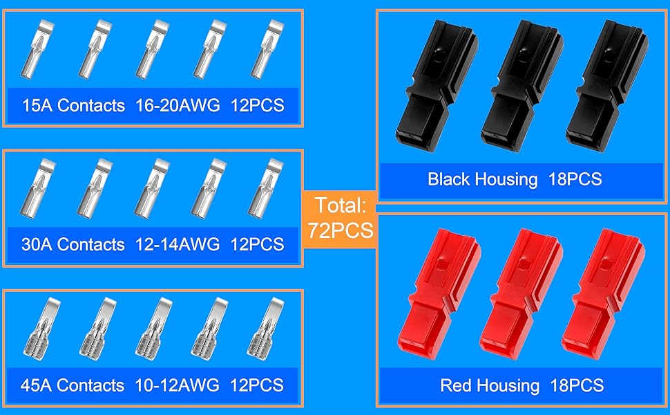 The Power Connectors Assortment Kit includes 72 unassembled pieces featuring quick-disconnect battery terminals and modular connectors, designed for optimal performance with silver-plated copper contacts. With a temperature rating of 150°C and compatibility for various electronic applications, this kit is perfect for professionals seeking efficiency and versatility.