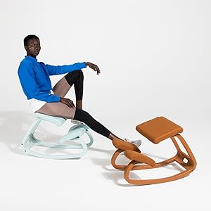The Varier Variable Monochrome kneeling chair, designed by Peter Opsvik in 1979, is a lightweight, ergonomically crafted wooden chair that promotes active sitting through its curved runners and adjustable positions. Its tilted seat design reduces lower back pressure, making it a timeless solution for healthier posture and dynamic office environments.