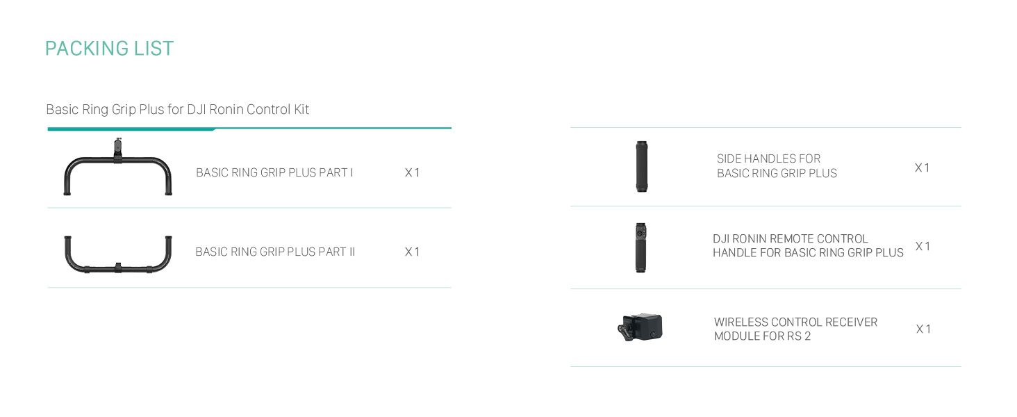| Included components | Basic Ring Grip Plus Part I *1, Basic Ring Grip Plus Part II *1, Remote Control Handle *1, Side Handles *1, Wireless Control Receiver Module *1 |