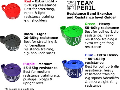 Achieve your fitness goals with Team Peril We offer 5 different level of resistance with our bands: • Red - Extra Light (5-10kg resistance) • Black - Light (20-35kg resistance) • Purple - Medium (45-55kg resistance) • Green - Heavy (55-80kg resistance) • Blue - Extra Heavy (80-105kg resistance) Size 208cm as a continuous loop, 104cm length of band. All bands are 4.4mm think with varying widths. Material - Natural latex Each order comes with a single band of choice. If you would like multiple bands of different or the same sizes, just add them individually to your basket before checking out. Uses Our bands are extremely versatile, and portable. They can be used on the go, at home, in the gym or with you travelling. They can be used to accompany your existing training regime or they can be used for entire full body workouts on their own. Below gives example of the sort of exercises that can be performed with our bands and the recommended size band to go with the exercise: • Red - stretching, mobility, Yoga, lateral raises • Black - light resistance training and stretching (push ups, shoulder press, lateral raises) • Purple - Resistance training, weightlifting, Crossfit etc. (squats, deadlifts, upright row) • Green - pull ups, dips, Weightlifting, powerlifting etc. • Blue - pull ups, dips, muscle ups, Weightlifting etc. Please note that this is only a guide and depending on your body weight and level of strength/fitness you may wish to use different bands for exercises shown above. Lifetime Warranty to give you peace of mind, if you are not 100% satisfied we will refund your money.