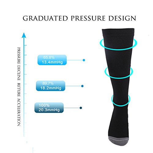 - SOCKS FUNCTION - Compression socks of 15-20mmHg provide graduated compression to support your foot heel, calf, arch, and ankle, reduce fatigue during flight, boost circulation and delivery of oxygen to your muscles, relieve pain caused by plantar fasciitis, varicose veins and legs swelling issues.