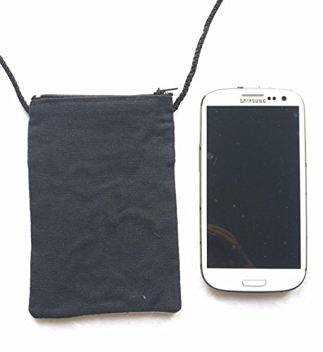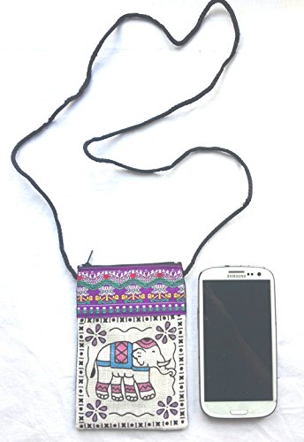 Lovely cotton mobile phone pouch with elephant design & neck strap. Pouch measures 15cm tall x 10cm wide and fits samsung s3, blackberry etc. Has one main zip pocket to keep phone, change and a spare key etc. Black shoulder strap/cord with 49cm drop. Cute and eye catching elephant design.