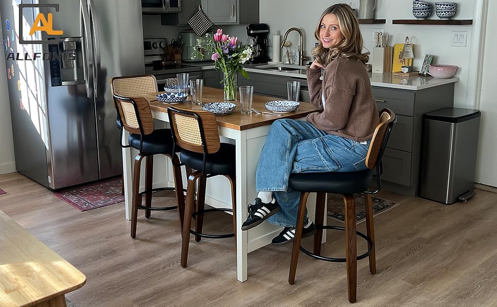 This set of four 26.4-inch counter height bar stools features ergonomic ventilated rattan backs for airflow and posture support, smooth 360-degree swivel functionality, and sturdy walnut wood construction supporting up to 330 pounds. Upholstered with thick faux leather cushions, these mid-century modern stools combine comfort, durability, and timeless style—perfect for kitchen islands, bars, or counters.