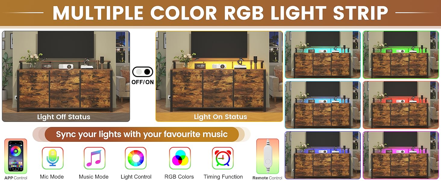 This 63-inch rustic brown dresser combines solid wood craftsmanship with a heavy-duty metal frame, featuring 9 spacious drawers, an integrated power outlet, and ambient LED lighting. Designed for modern living, it offers versatile storage and a sleek, durable design that enhances any bedroom or living space.